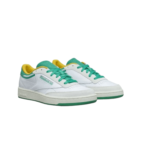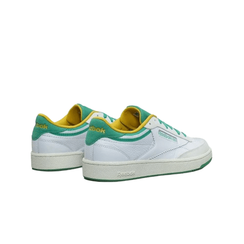 celebra 40 años de un icono del tenis. las zapatillas reebok club c 85 apuestan por las vibraciones clásicas con una parte superior de cuero abatanado y superposiciones de gamuza. las correas en el cuello están inspiradas en las bandas para el sudor, y los acentos de color retro del tenis completan el homenaje.